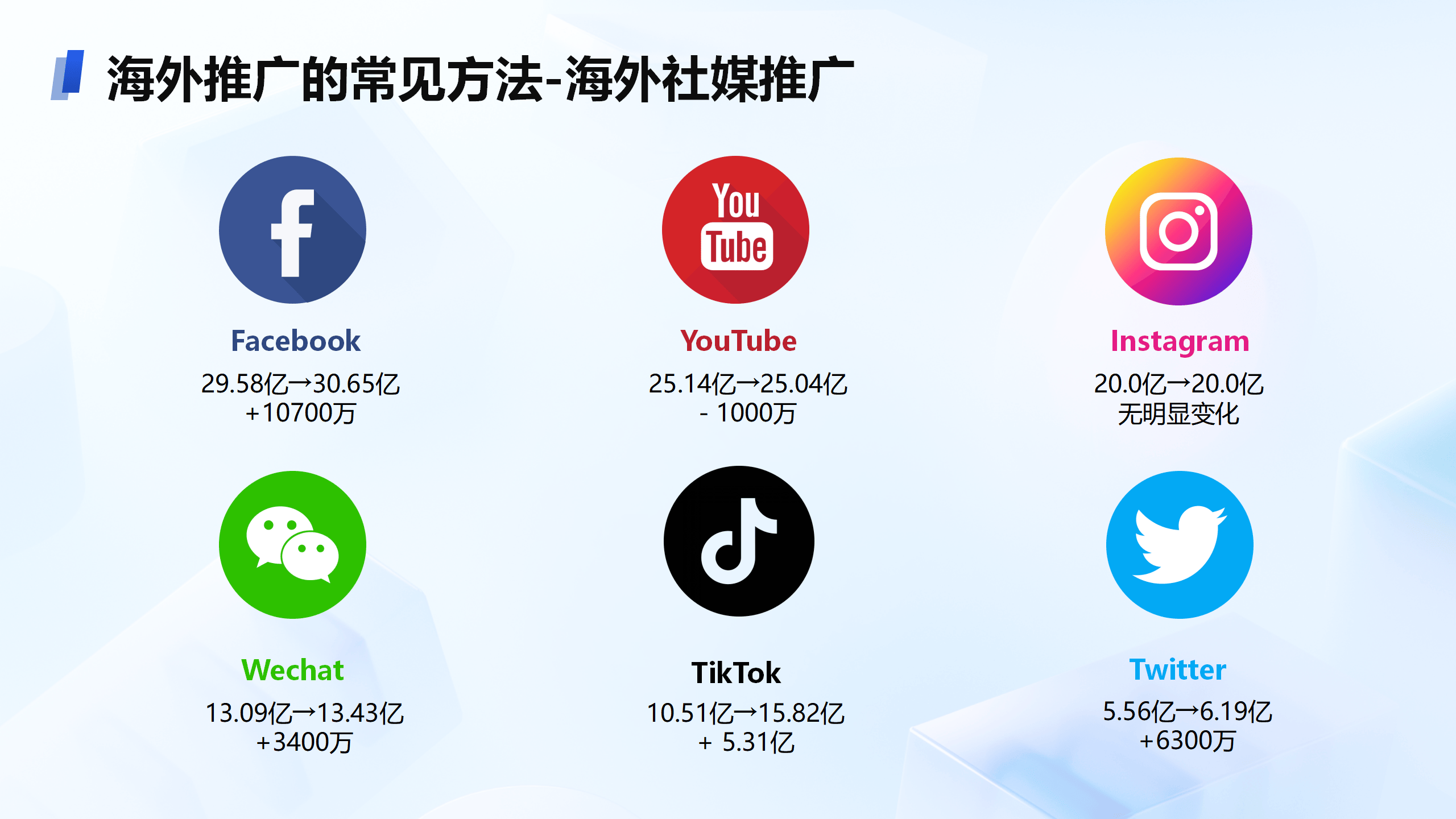 :针对Facebook、Instagram、YouTube、TikTok等全球大的社交媒体平台,提供多平台同时运营服务,充分把握商机。