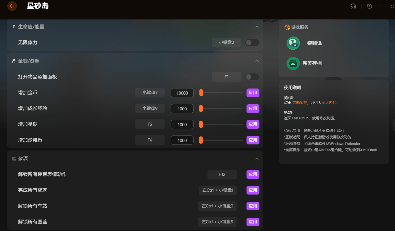除了这两个,图上还能加金币加星砂。操作也简单,进游戏之后切出来点应用就生效。这软件只支持单机玩的时候用,正版游戏才能适配。用之前记得把杀毒软件关掉,省的给拦截了。想快速体验游戏后期内容的玩家,可以试试这个。